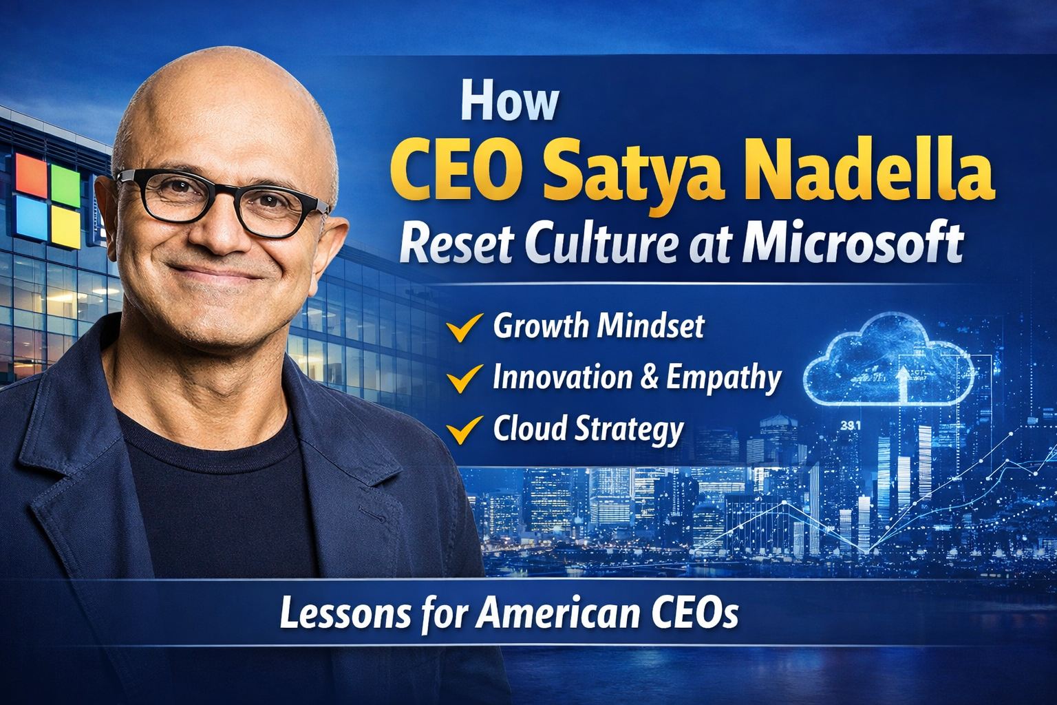 CEO Satya Nadella completely reset Microsoft’s culture by introducing empathy, collaboration, and innovation. He shifted the company’s focus toward cloud computing, teamwork, and growth mindset thinking.